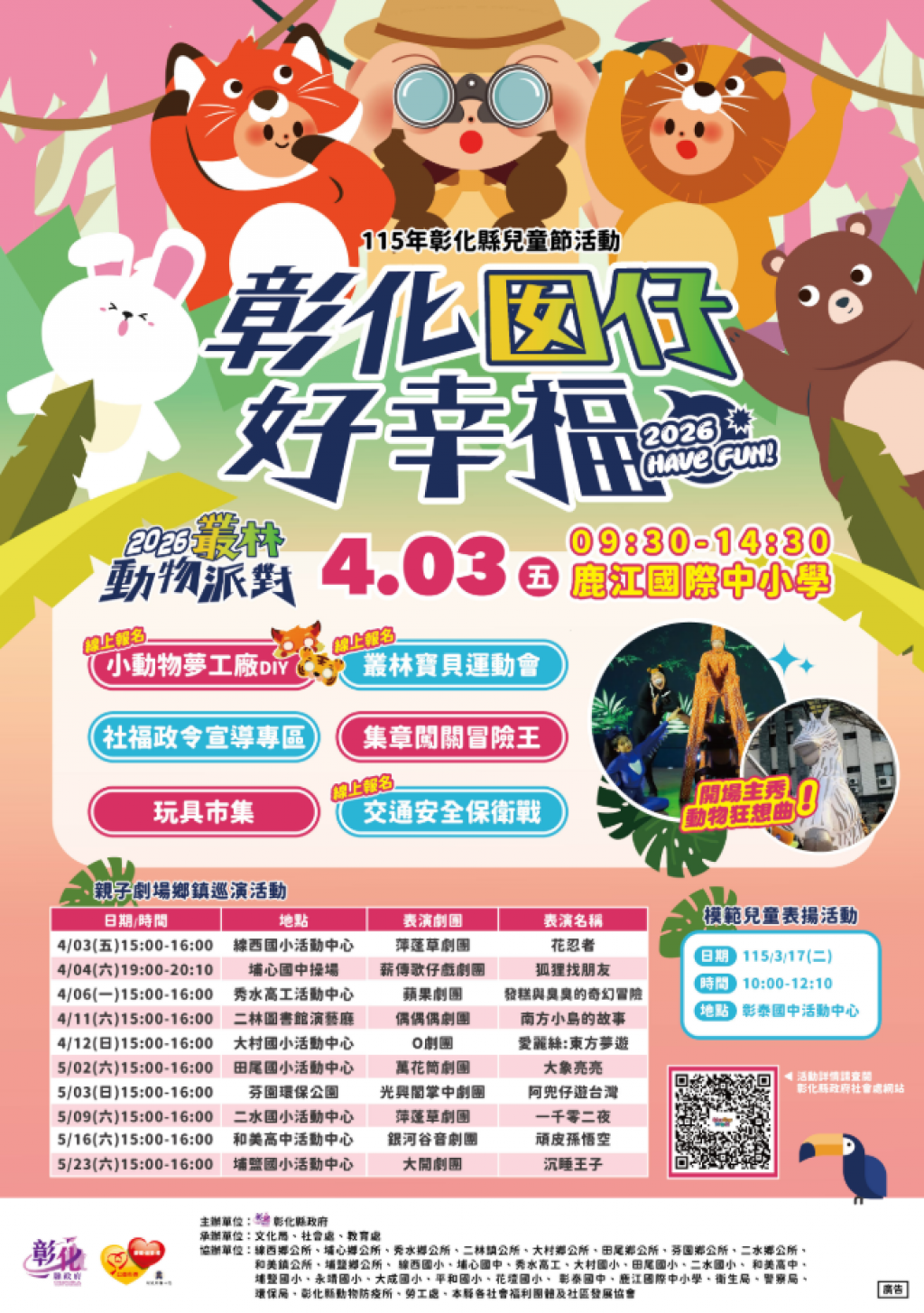 為慶祝115年兒童節,本府規劃辦理「彰化囡仔好幸福-2026叢林動物派對」活動,鼓勵大家踴躍參加。
