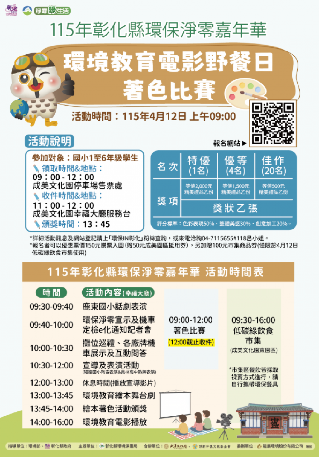 本局於4月12日(星期日)上午9時至下午4時,結合繪畫著色比賽活動、環境教育繪本舞台劇、環境教育電影及綠色飲食零廢棄攤位,於成美文化園幸福大廳辦理活動,活動為免費參加。