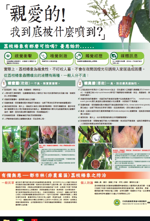 非農業環境中荔枝椿象蟲源主要來自龍眼樹或臺灣欒樹,因該蟲受擾動時會噴出具腐蝕性臭液自我保護,如觸及人體皮膚或眼睛,可造成灼傷或失明危險,請多加留意自身安全